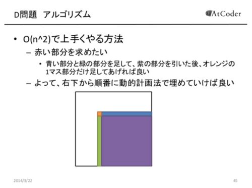 問題 D: おいしいたこ焼きの焼き方 - AtCoder Beginner Contest 005 | AtCoder ソースコード 解説 AtCoder Beginner Contest 005 解説 from AtCoder Inc. www.slideshare.net AtCoderより こちらを参考に。 実装の流れ 1. ある点から始点(1, 1)までの範囲の…